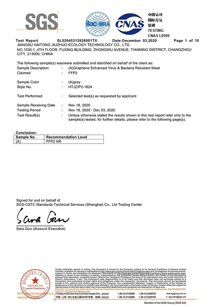 SGS FFP2检测报告- 纳米铜石墨烯口罩(折叠型)