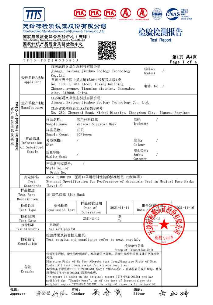 ASTM F2100-20检验检测报告- 医用外科口罩