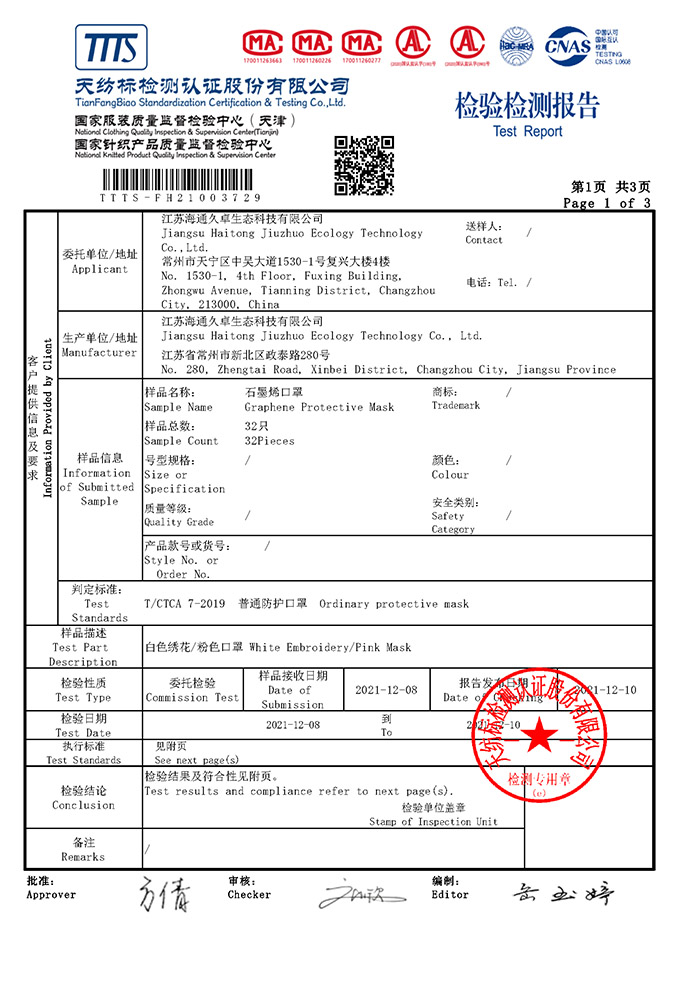 T/CTCA 7-2019检测报告- 石墨烯口罩