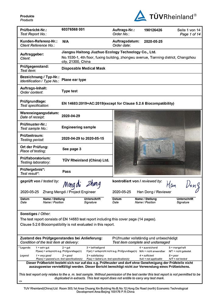 TUV EN14683检测报告- 一次性医用口罩TypeI