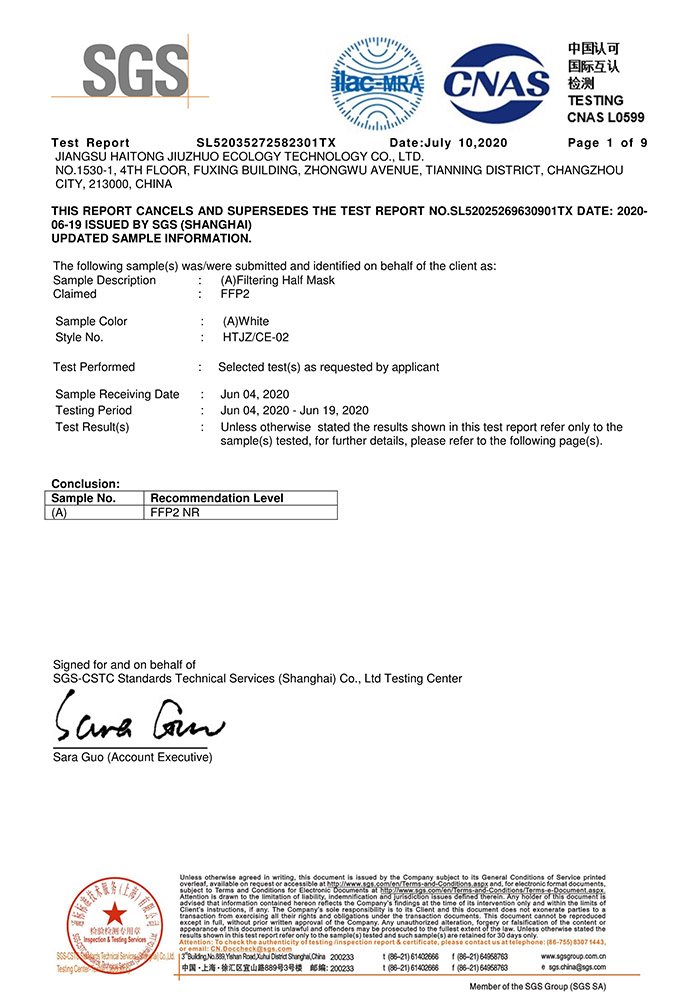 SGS FFP2检测报告- 纳米铜石墨烯口罩(折叠型)