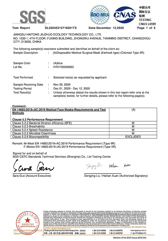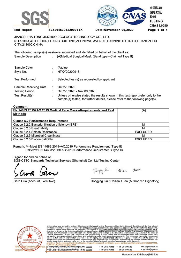 SGS EN14683检测报告- 医用外科口罩耳挂式TypeII