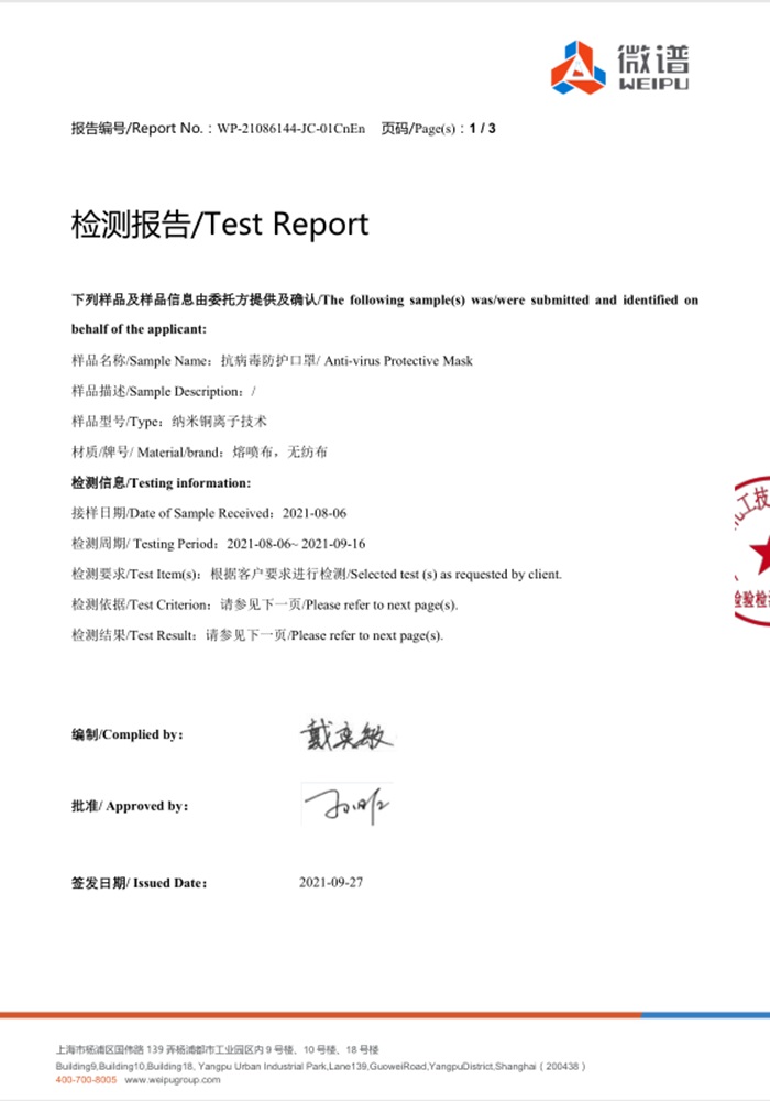抗病毒防护口罩检验检测报告(中文版)